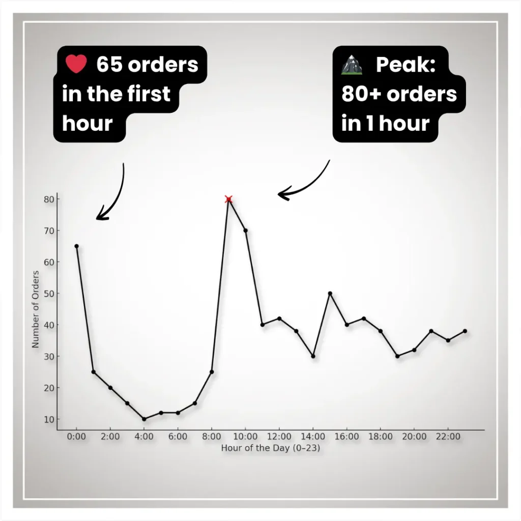 Siamo partiti forte con 65 ordini nella prima ora e abbiamo raggiunto un picco di 80 ordini all'ora. La vendita si è svolta rapidamente e alcuni prodotti sono andati esauriti prima del previsto.