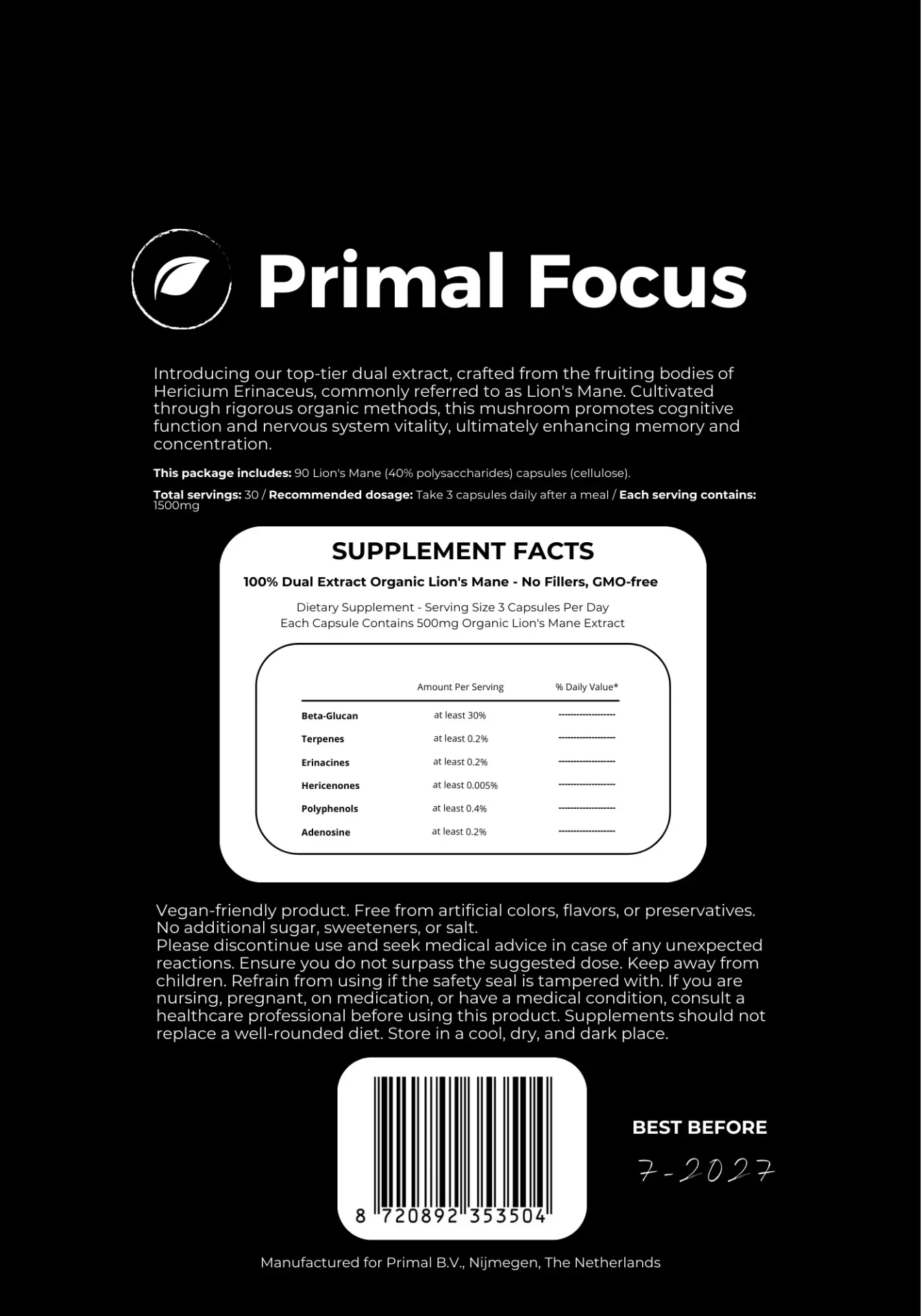 Take 1–3 capsules daily with water. Best taken in the morning or early afternoon to support your cognitive rhythm. Effects are cumulative — most users report best results after 2–4 weeks of consistent use.
